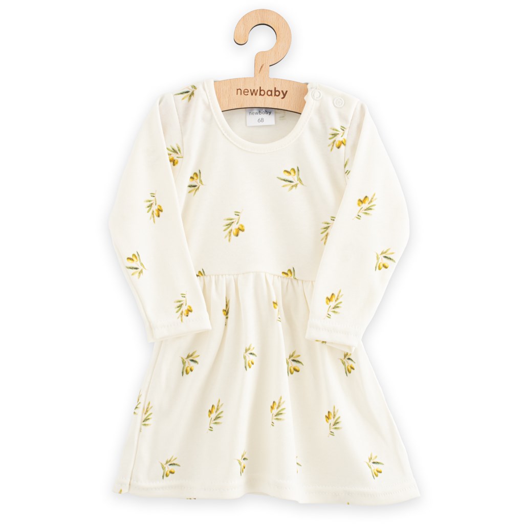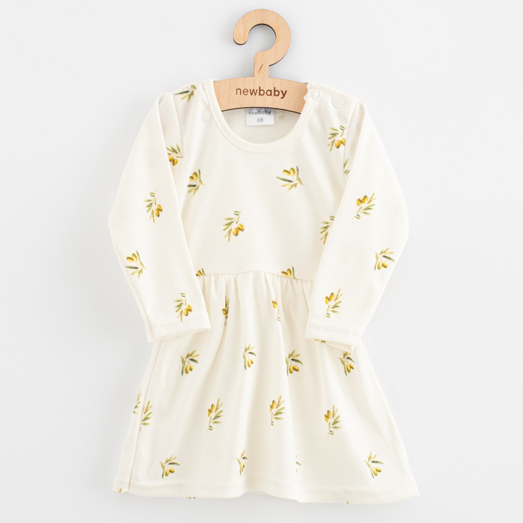 Finom biopamutból készült aranyos kisruha minden kisheregnő számára. A ruha olajbogyó mintával van díszítve. Patentos, ami megkönnyíti a baba öltöztetését. A kellemes, puha és minőségi anyagnak köszönhetően babája nagyon kellemesen és kényelmesen fogja érezni magát.