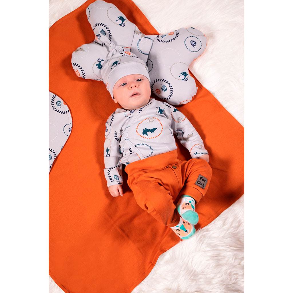 Stílusos Nicol Fox Club sapka aranyos bojttal a felső részén. A sapkát elragadó nyomtatott rókás motívum díszíti. Remek darab, amely csodás kiegészítőként vagy praktikus ruhadarabként használható. A szegély széles, ami nem nyomja a baba fejét. Kellemes tapintású és éppen a baba fejére illik. A Fox Club egy új, meseszép kollekció, amit a kisbabák igényeit figyelembe véve terveztek. Anyaga: 100% pamut.