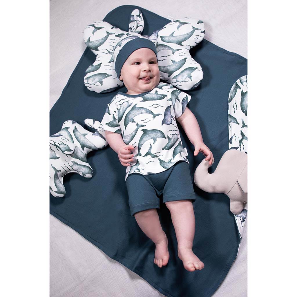 Gyönyörű Nicol Dolphin pamut kendősapka babáknak. Kendő fazonú sapka rugalmas szegéllyel, teljes felületén dolphin mintával. Kiváló minőségű, kellemes anyagának köszönhetően a baba nagyon kellemesen és kényelmesen fogja érezni magát benne. Összetétel: 100% pamut.