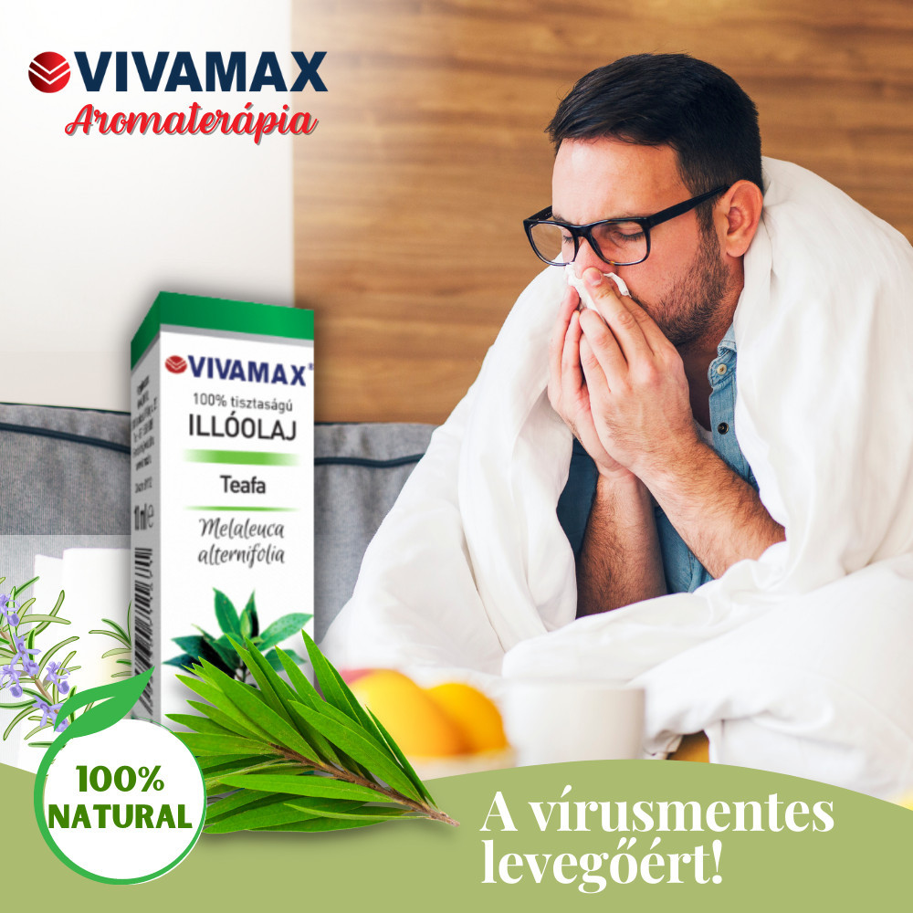 100% tisztaságú teafa illóolaj diffúzorba és bőrápoláshoz A Vivamax illóolajok 100% tisztaságú, prémium minőségű olajok. Kiválóan használhatóak diffúzorokhoz és az aroma USB párologtatóhoz is. Hatékonyan és hosszú távon illatosítják a helyiség légterét, miközben az illóolajok kifejti jótékony hatásukat. Terápiás minőségű teafa olaj, (Melaleuca alternifolia), melynek illóolaját vízgőzdesztillációval a növény leveleiből állítják elő. A teafa illóolaj tulajdonságai: Meleg, fűszeres, kámforos fejillattal, átható, orvosságos aljegyekkel rendelkezik. Áttetsző, hígan folyó olaj Tulajdonságok: Fertőzést gátló, vírus és baktériumölő készítmények alkotórésze Nagyon erős baktérium-, vírus-, és gombaölő Gyulladás- és fájdalomcsökkentő hatással is rendelkezik. Lelkileg erősítő, melengető hatással bír. Élénkíti a testet és a szellemet. Zsíros, pattanásos, gyulladásos bőr ápolására is alkalmas. Felhasználási javaslat: Aromalámpába 4-5 cseppet, a fürdővízhez 8-10 csepp illóolajat adjunk. Bőrápoláshoz lemosáshoz 4-5 csepp illóolajat csepegtessünk 1dl növényi olajba vagy vízben oldva. Különleges tudnivalók: A teafa illóolaja enyhén mérgező, nagyon enyhén irritáló, ezért túlérzékeny bőrön a használata kerülendő, ugyanakkor nem érzékenyít és nem fototoxikus. Kiszerelés: 10 ml